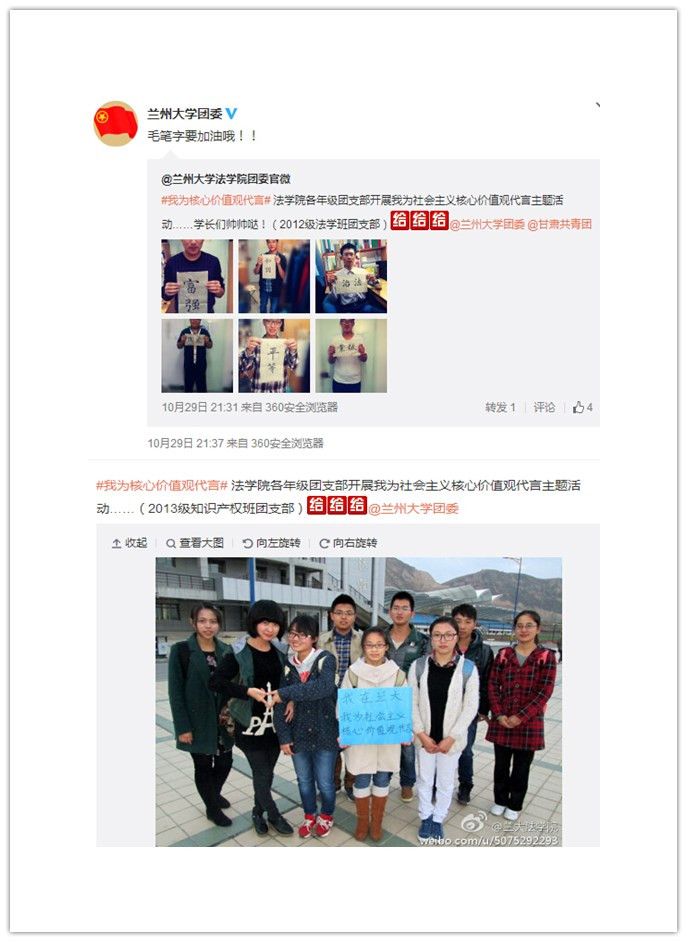 本次“我为社会主义核心价值观代言”主题活动旨在宣传社会主义核心价值观的内涵和大家关于社会主义核心价值观的认识,通过在微博、QQ等新传播途径展开宣传,扩大了宣传范围,起到了很好的宣传效果。