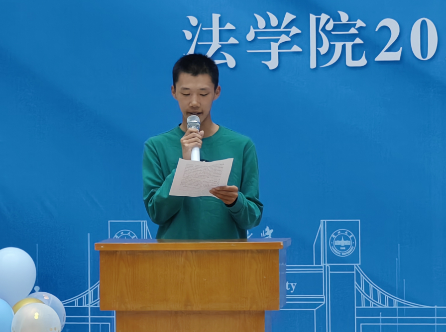 2020级法学班李江怡代表高年级同学对学弟学妹的到来表示热烈欢迎,她谈起了三年在金沙威尼斯欢乐娱人城度过的美好时光,希望学弟学妹们珍惜当下,不负青春韶华,不断去探索未知的领域,用努力与汗水谱写青春之歌,实现人生理想。
